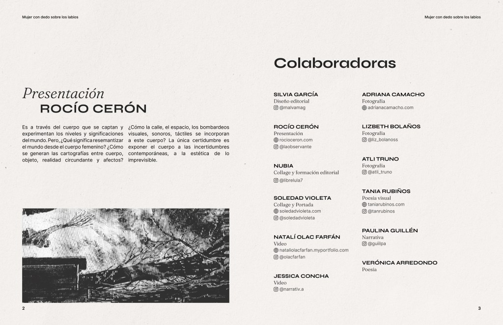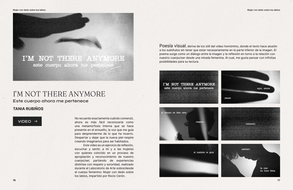 Este vídeo es un ejercicio de reflexión, de escuchar y sentir, a mí y a las mujeres con quienes coincido en un proceso de apropiación y reconocimiento de nuestro cuerpo/ser, partiendo de experiencias distintas con respeto y sororidad. Vídeo realizado durante el Laboratorio de Arte sobre/desde el cuerpo femenino “Mujer con dedo sobre los labios”. Impartido por Rocío Cerón.